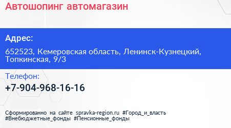 Автошопинг, автомагазин по адресу 652523, Кемеровская область, Ленинск-Кузнецкий, Топкинская, 9/3 в дальнейшем Организация, размещена в следующих категориях: