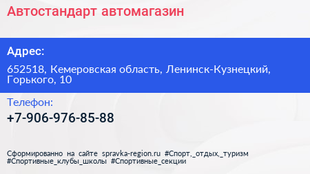 Автостандарт, автомагазин по адресу 652518, Кемеровская область, Ленинск-Кузнецкий, Горького, 10 в дальнейшем Организация, размещена в следующих категориях: