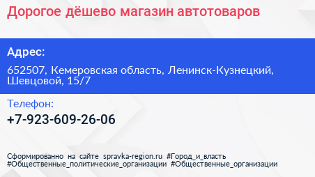 Дорогое-дёшево, магазин автотоваров по адресу 652507, Кемеровская область, Ленинск-Кузнецкий, Шевцовой, 15/7 в дальнейшем Организация, размещена в следующих категориях: