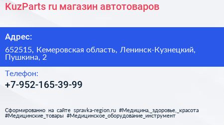 KuzParts.ru, магазин автотоваров по адресу 652515, Кемеровская область, Ленинск-Кузнецкий, Пушкина, 2 в дальнейшем Организация, размещена в следующих категориях: