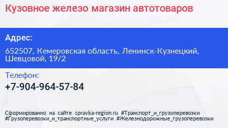 Кузовное железо, магазин автотоваров по адресу 652507, Кемеровская область, Ленинск-Кузнецкий, Шевцовой, 19/2 в дальнейшем Организация, размещена в следующих категориях:
