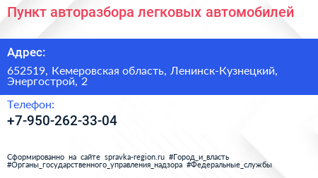 Пункт авторазбора легковых автомобилей по адресу 652519, Кемеровская область, Ленинск-Кузнецкий, Энергострой, 2 в дальнейшем Организация, размещена в следующих категориях:
