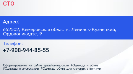 СТО по адресу 652502, Кемеровская область, Ленинск-Кузнецкий, Орджоникидзе, 9 в дальнейшем Организация, размещена в следующих категориях: