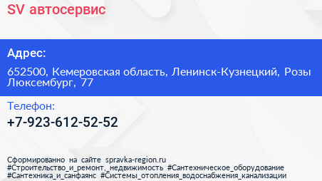 SV, автосервис по адресу 652500, Кемеровская область, Ленинск-Кузнецкий, Розы Люксембург, 77 в дальнейшем Организация, размещена в следующих категориях: