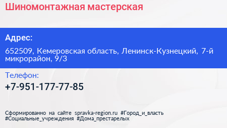 Шиномонтажная мастерская по адресу 652509, Кемеровская область, Ленинск-Кузнецкий, 7-й микрорайон, 9/3 в дальнейшем Организация, размещена в следующих категориях: