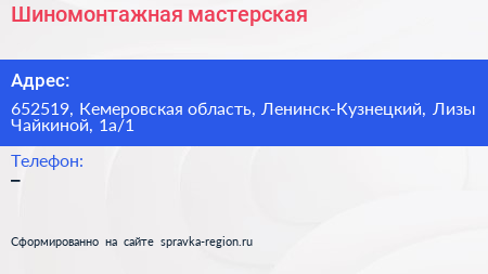 Шиномонтажная мастерская по адресу 652519, Кемеровская область, Ленинск-Кузнецкий, Лизы Чайкиной, 1а/1 в дальнейшем Организация, размещена в следующих категориях: