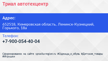Триал, автотехцентр по адресу 652518, Кемеровская область, Ленинск-Кузнецкий, Горького, 18а в дальнейшем Организация, размещена в следующих категориях: