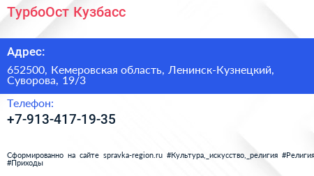 ТурбоОст-Кузбасс по адресу 652500, Кемеровская область, Ленинск-Кузнецкий, Суворова, 19/3 в дальнейшем Организация, размещена в следующих категориях: