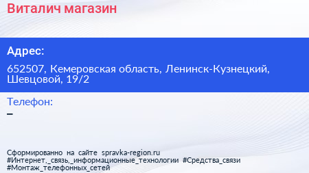 Виталич, магазин по адресу 652507, Кемеровская область, Ленинск-Кузнецкий, Шевцовой, 19/2 в дальнейшем Организация, размещена в следующих категориях: