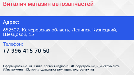 Виталич, магазин автозапчастей по адресу 652507, Кемеровская область, Ленинск-Кузнецкий, Шевцовой, 15 в дальнейшем Организация, размещена в следующих категориях: