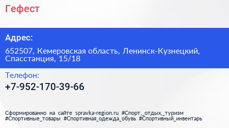 Гефест по адресу 652507, Кемеровская область, Ленинск-Кузнецкий, Спасстанция, 15/18 в дальнейшем Организация, размещена в следующих категориях: