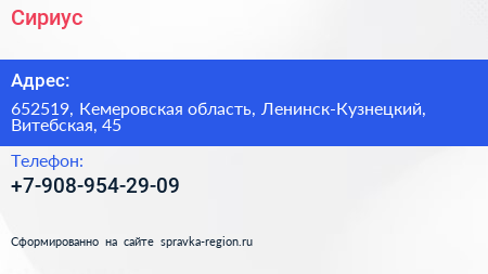 Сириус по адресу 652519, Кемеровская область, Ленинск-Кузнецкий, Витебская, 45 в дальнейшем Организация, размещена в следующих категориях: