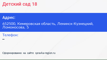 Детский сад №18 по адресу 652500, Кемеровская область, Ленинск-Кузнецкий, Ломоносова, 5 в дальнейшем Организация, размещена в следующих категориях: