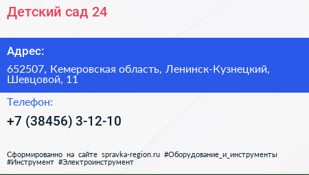 Детский сад №24 по адресу 652507, Кемеровская область, Ленинск-Кузнецкий, Шевцовой, 11 в дальнейшем Организация, размещена в следующих категориях: