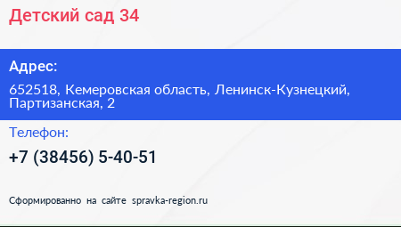 Детский сад №34 по адресу 652518, Кемеровская область, Ленинск-Кузнецкий, Партизанская, 2 в дальнейшем Организация, размещена в следующих категориях: