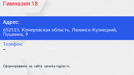 Гимназия №18 по адресу 652515, Кемеровская область, Ленинск-Кузнецкий, Пушкина, 9 в дальнейшем Организация, размещена в следующих категориях:
