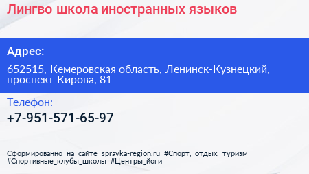Лингво, школа иностранных языков по адресу 652515, Кемеровская область, Ленинск-Кузнецкий, проспект Кирова, 81 в дальнейшем Организация, размещена в следующих категориях: