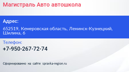Магистраль-Авто, автошкола по адресу 652519, Кемеровская область, Ленинск-Кузнецкий, Шилина, 6 в дальнейшем Организация, размещена в следующих категориях: