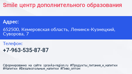Smile, центр дополнительного образования по адресу 652500, Кемеровская область, Ленинск-Кузнецкий, Суворова, 7 в дальнейшем Организация, размещена в следующих категориях: