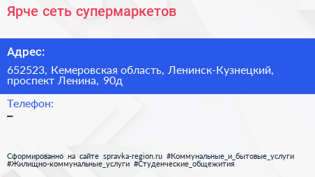 Ярче!, сеть супермаркетов по адресу 652523, Кемеровская область, Ленинск-Кузнецкий, проспект Ленина, 90д в дальнейшем Организация, размещена в следующих категориях:
