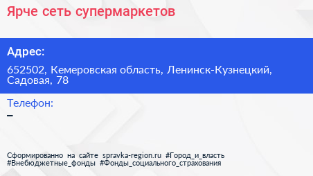 Ярче!, сеть супермаркетов по адресу 652502, Кемеровская область, Ленинск-Кузнецкий, Садовая, 78 в дальнейшем Организация, размещена в следующих категориях: