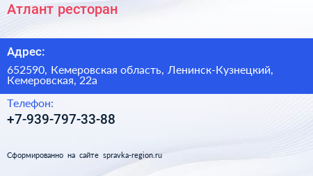 Атлант, ресторан по адресу 652590, Кемеровская область, Ленинск-Кузнецкий, Кемеровская, 22а в дальнейшем Организация, размещена в следующих категориях: