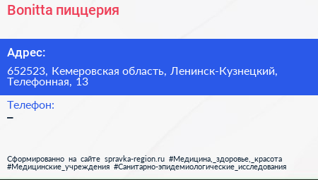 Bonitta, пиццерия по адресу 652523, Кемеровская область, Ленинск-Кузнецкий, Телефонная, 13 в дальнейшем Организация, размещена в следующих категориях: