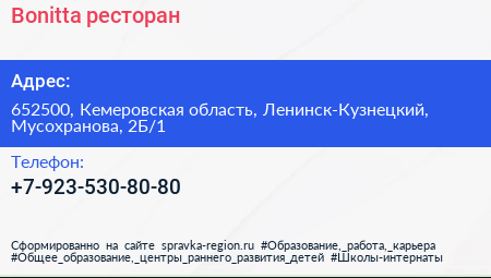 Bonitta, ресторан по адресу 652500, Кемеровская область, Ленинск-Кузнецкий, Мусохранова, 2Б/1 в дальнейшем Организация, размещена в следующих категориях: