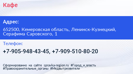 Кафе по адресу 652500, Кемеровская область, Ленинск-Кузнецкий, Серафима Саровского, 1 в дальнейшем Организация, размещена в следующих категориях: