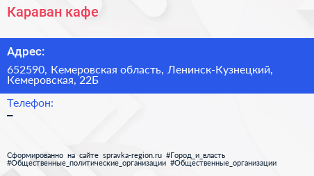 Караван, кафе по адресу 652590, Кемеровская область, Ленинск-Кузнецкий, Кемеровская, 22Б в дальнейшем Организация, размещена в следующих категориях: