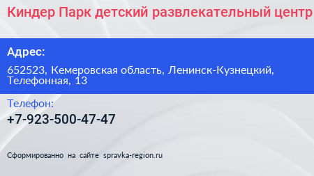 Киндер Парк, детский развлекательный центр по адресу 652523, Кемеровская область, Ленинск-Кузнецкий, Телефонная, 13 в дальнейшем Организация, размещена в следующих категориях: