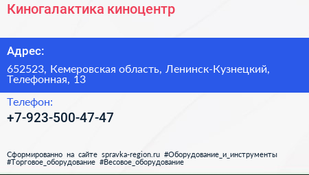 Киногалактика, киноцентр по адресу 652523, Кемеровская область, Ленинск-Кузнецкий, Телефонная, 13 в дальнейшем Организация, размещена в следующих категориях: