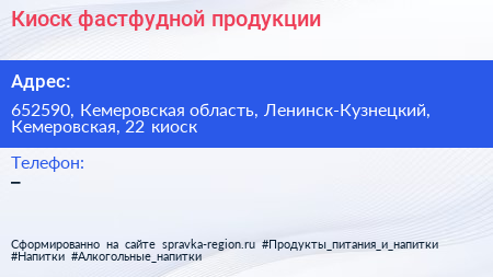 Киоск фастфудной продукции по адресу 652590, Кемеровская область, Ленинск-Кузнецкий, Кемеровская, 22 киоск в дальнейшем Организация, размещена в следующих категориях: