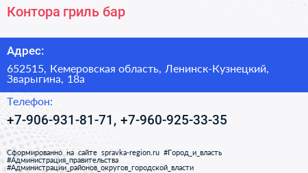 Контора, гриль-бар по адресу 652515, Кемеровская область, Ленинск-Кузнецкий, Зварыгина, 18а в дальнейшем Организация, размещена в следующих категориях:
