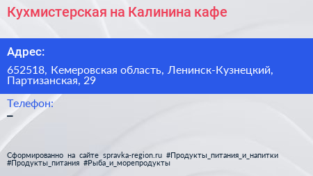 Кухмистерская на Калинина, кафе по адресу 652518, Кемеровская область, Ленинск-Кузнецкий, Партизанская, 29 в дальнейшем Организация, размещена в следующих категориях: