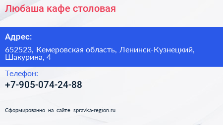 Любаша, кафе-столовая по адресу 652523, Кемеровская область, Ленинск-Кузнецкий, Шакурина, 4 в дальнейшем Организация, размещена в следующих категориях: