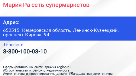 Мария-Ра, сеть супермаркетов по адресу 652515, Кемеровская область, Ленинск-Кузнецкий, проспект Кирова, 94 в дальнейшем Организация, размещена в следующих категориях: