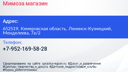 Мимоза, магазин по адресу 652519, Кемеровская область, Ленинск-Кузнецкий, Менделеева, 7а/2 в дальнейшем Организация, размещена в следующих категориях: