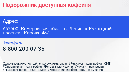 Подорожник, доступная кофейня по адресу 652500, Кемеровская область, Ленинск-Кузнецкий, проспект Кирова, 46/1 в дальнейшем Организация, размещена в следующих категориях:
