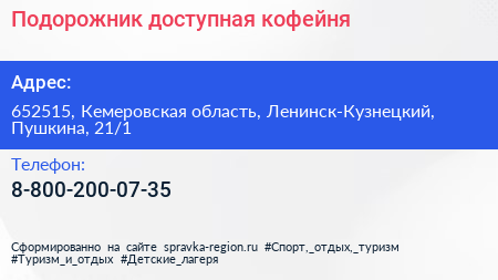 Подорожник, доступная кофейня по адресу 652515, Кемеровская область, Ленинск-Кузнецкий, Пушкина, 21/1 в дальнейшем Организация, размещена в следующих категориях: