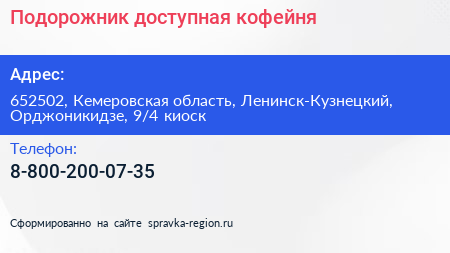 Подорожник, доступная кофейня по адресу 652502, Кемеровская область, Ленинск-Кузнецкий, Орджоникидзе, 9/4 киоск в дальнейшем Организация, размещена в следующих категориях: