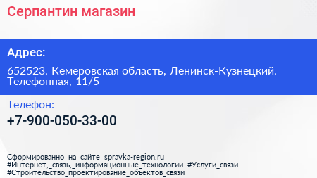Серпантин, магазин по адресу 652523, Кемеровская область, Ленинск-Кузнецкий, Телефонная, 11/5 в дальнейшем Организация, размещена в следующих категориях: