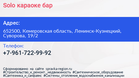 Solo, караоке-бар по адресу 652500, Кемеровская область, Ленинск-Кузнецкий, Суворова, 19/2 в дальнейшем Организация, размещена в следующих категориях: