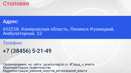 Столовая по адресу 652518, Кемеровская область, Ленинск-Кузнецкий, Амбулаторная, 12 в дальнейшем Организация, размещена в следующих категориях: