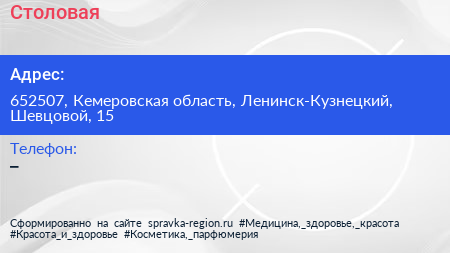 Столовая по адресу 652507, Кемеровская область, Ленинск-Кузнецкий, Шевцовой, 15 в дальнейшем Организация, размещена в следующих категориях: