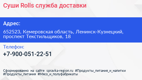 Суши & Rolls, служба доставки по адресу 652523, Кемеровская область, Ленинск-Кузнецкий, проспект Текстильщиков, 18 в дальнейшем Организация, размещена в следующих категориях: