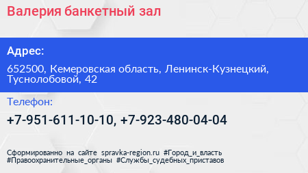 Валерия, банкетный зал по адресу 652500, Кемеровская область, Ленинск-Кузнецкий, Туснолобовой, 42 в дальнейшем Организация, размещена в следующих категориях: