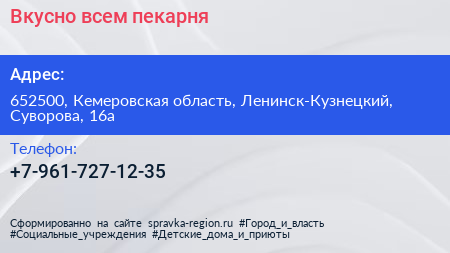 Вкусно всем, пекарня по адресу 652500, Кемеровская область, Ленинск-Кузнецкий, Суворова, 16а в дальнейшем Организация, размещена в следующих категориях: