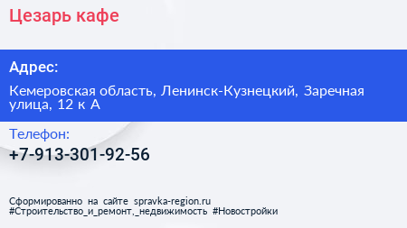 Цезарь, кафе по адресу Кемеровская область, Ленинск-Кузнецкий, Заречная улица, 12 к А в дальнейшем Организация, размещена в следующих категориях:
