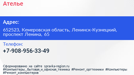 Ателье по адресу 652523, Кемеровская область, Ленинск-Кузнецкий, проспект Ленина, 65 в дальнейшем Организация, размещена в следующих категориях: